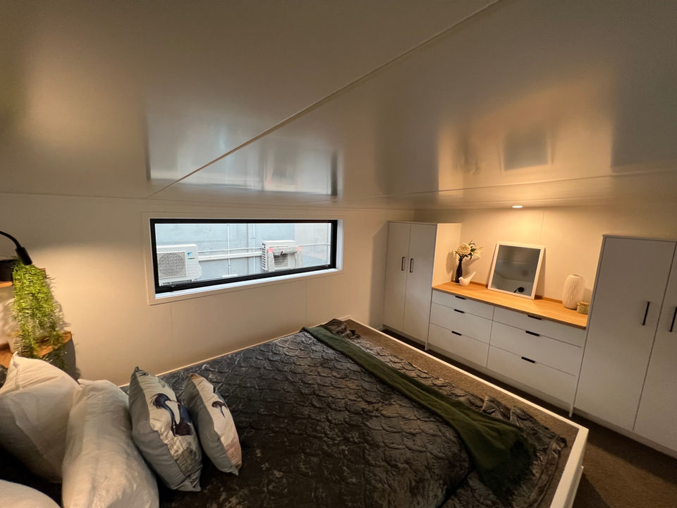 The Lotus is a beautifully designed two-bedroom home that blends comfort with smart functionality. Large tri-fold doors open to a stylish central kitchen with a movable breakfast island and a cozy end lounge—perfect for relaxing or entertaining. A spacious downstairs laundry makes life easier, with clever under-stair storage, large cupboards, and a dedicated washing machine cavity. The bathroom features a roomy 900x900mm shower and a separate toilet. Upstairs, a standing-height walkway connects two bedrooms: a master with a built-in wardrobe and a versatile second room ideal as a lounge, guest room, office, or kids’ space.